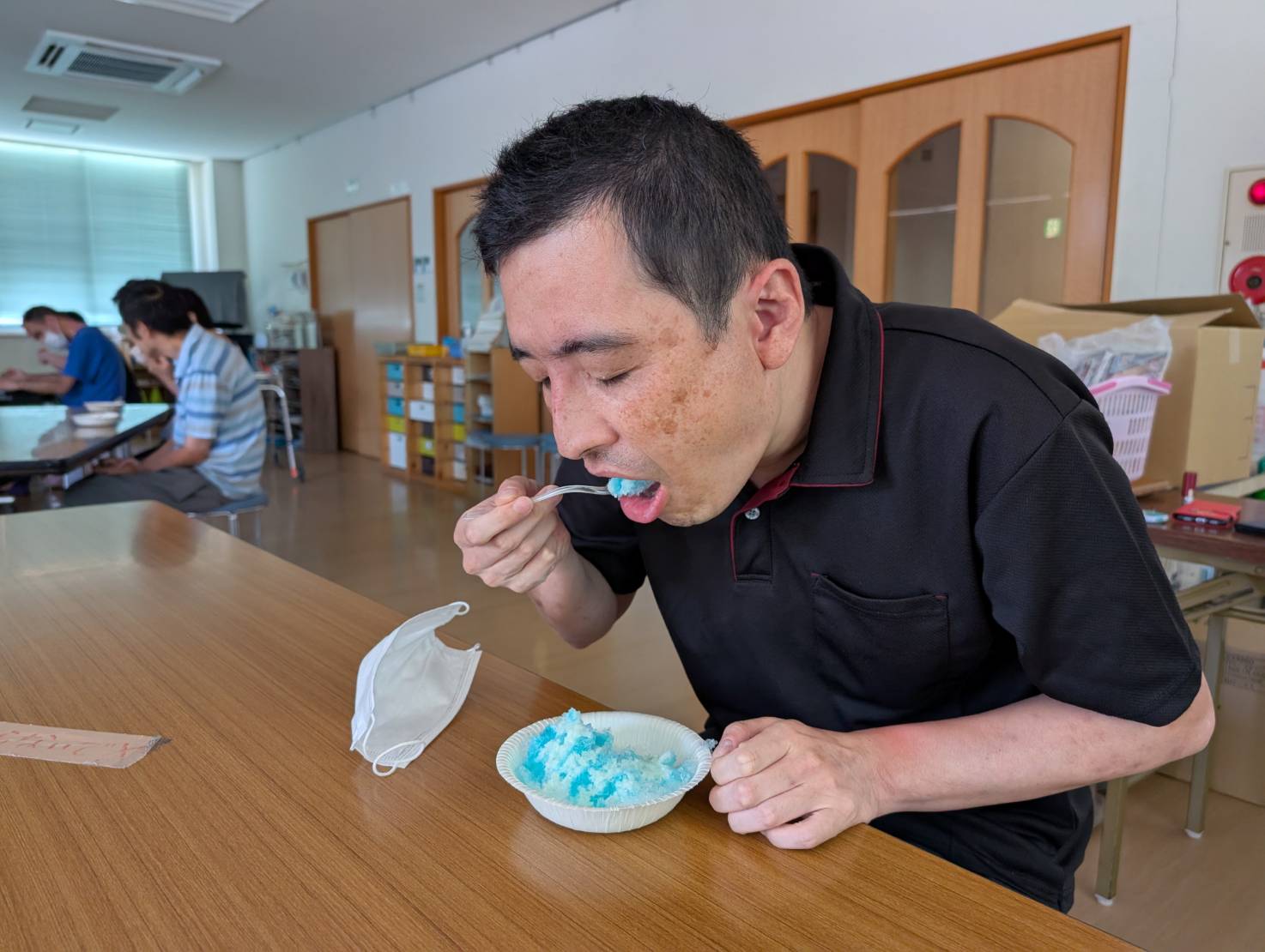 自分の食べるかき氷をかき氷機で削り、好きなシロップをかけていただきました。「冷たい!」「頭がキーンとする!」と盛り上がりながら、美味しそうに食べられていました。