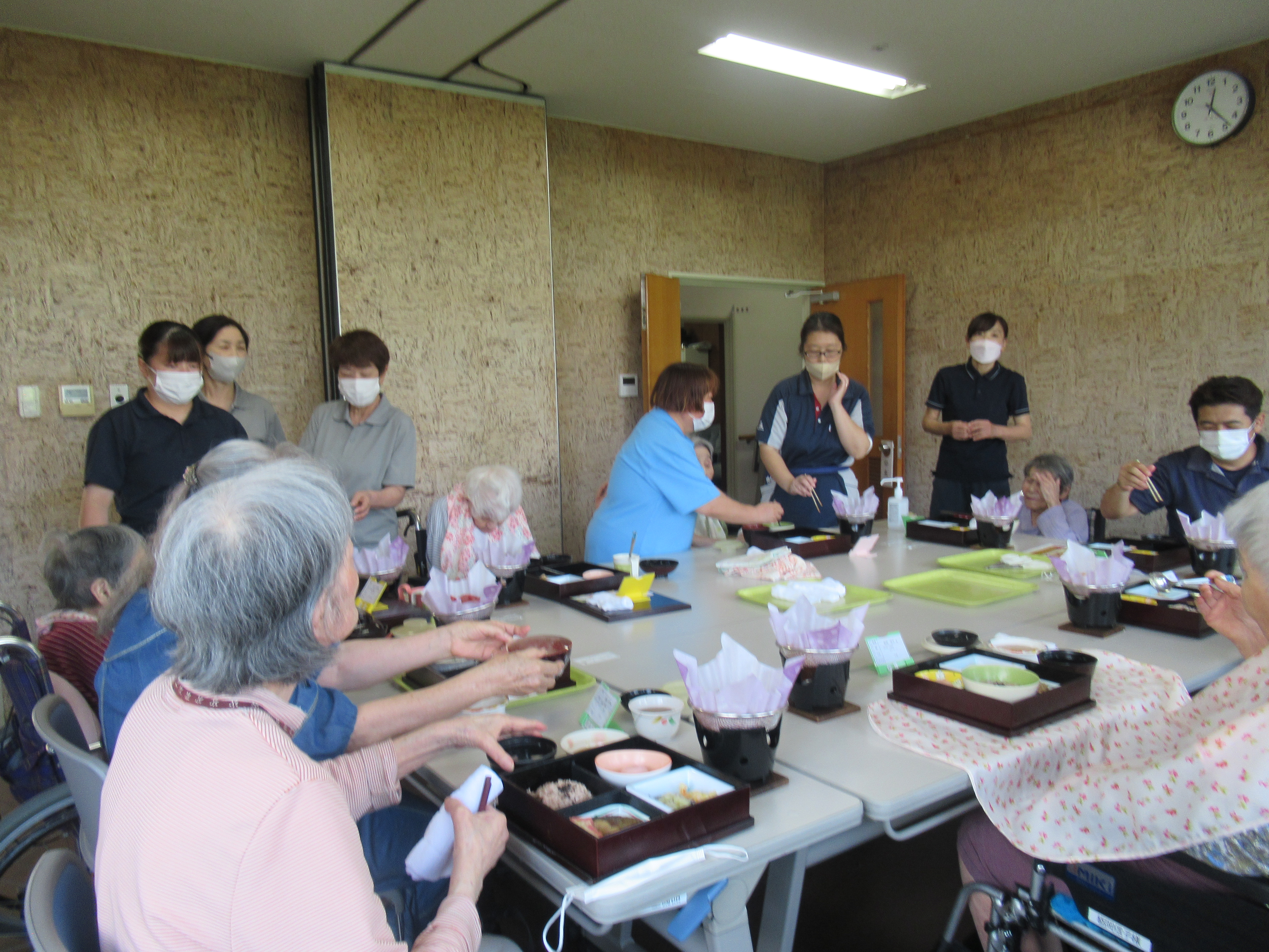 米寿、卒寿、百寿のお祝いのご利用者にはお祝い膳とすき焼きを食べていただきました。