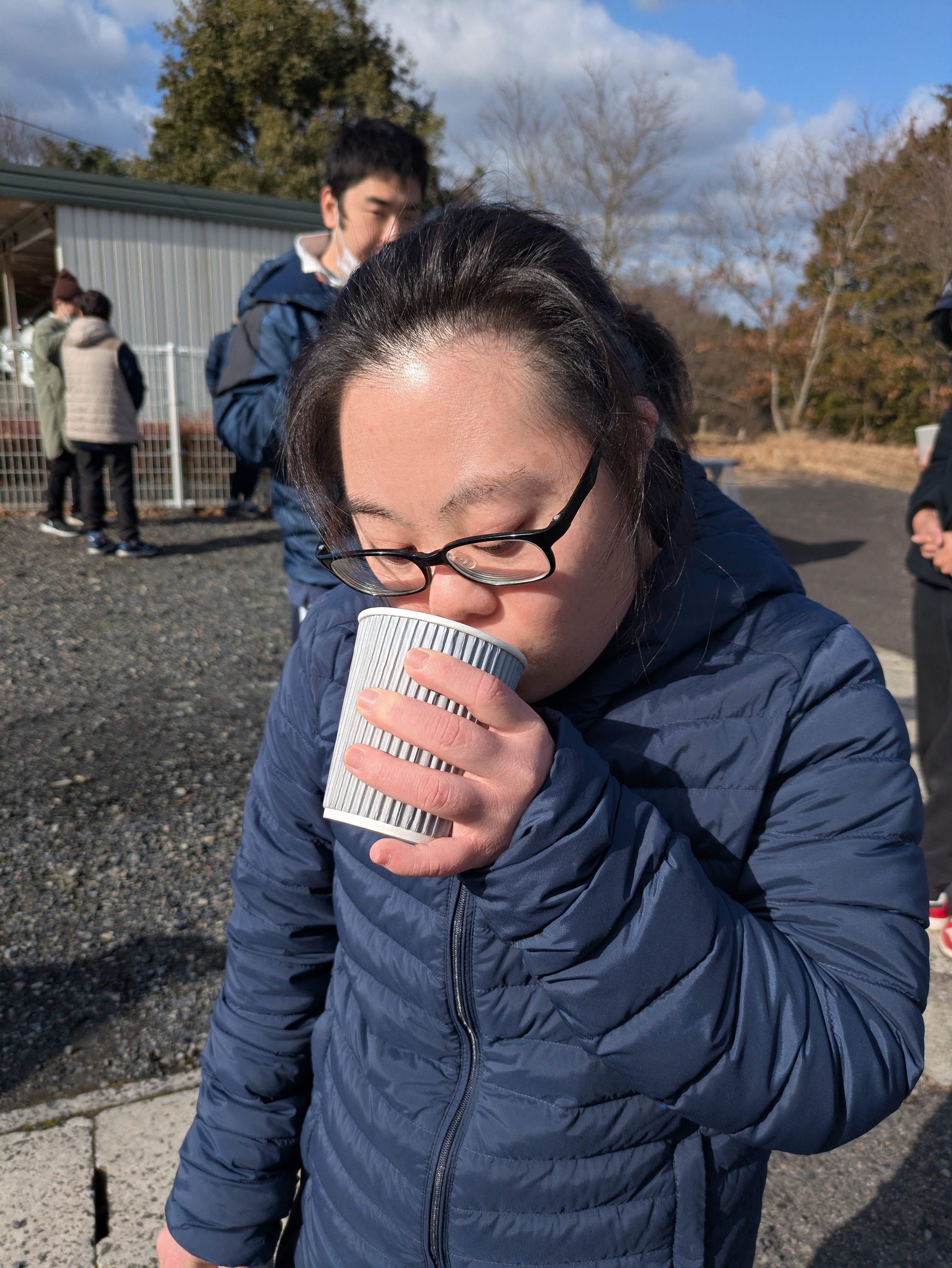 火に書初めをくべ、空高く半紙が舞う姿を見ながら、温かい甘酒を楽しみました。
