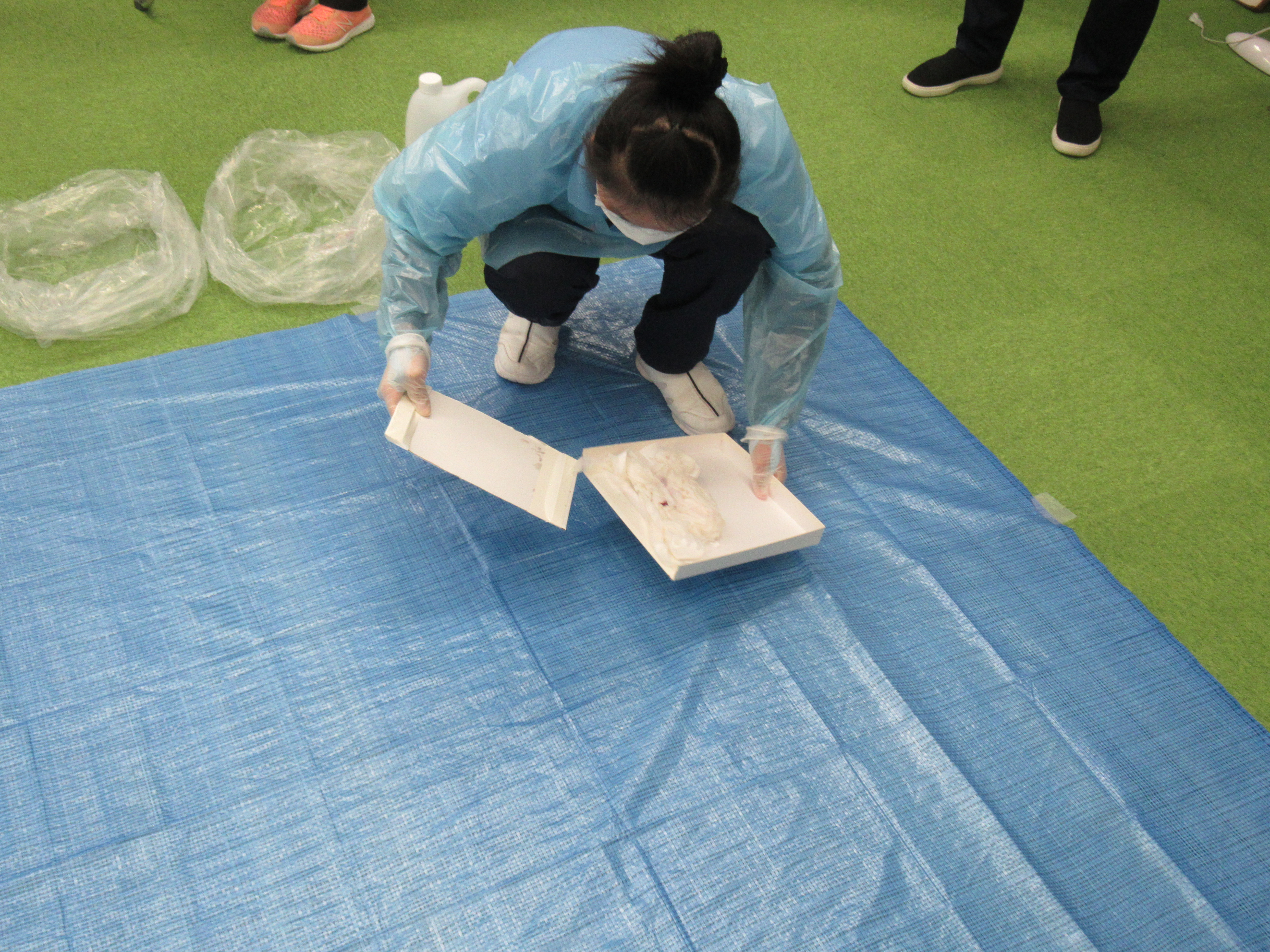 その後、防護具の着脱、嘔吐物の処理方法の実技を行いました。